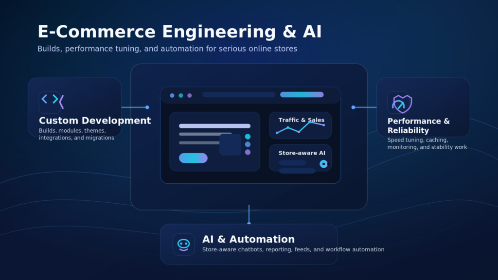 We’re comfortable in the weeds: Dockerized stacks, Redis, MySQL tuning, custom modules, AI integrations, and all the messy parts of keeping a serious store online and fast.